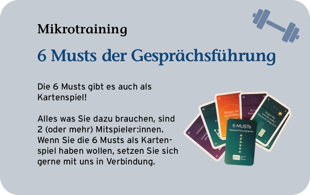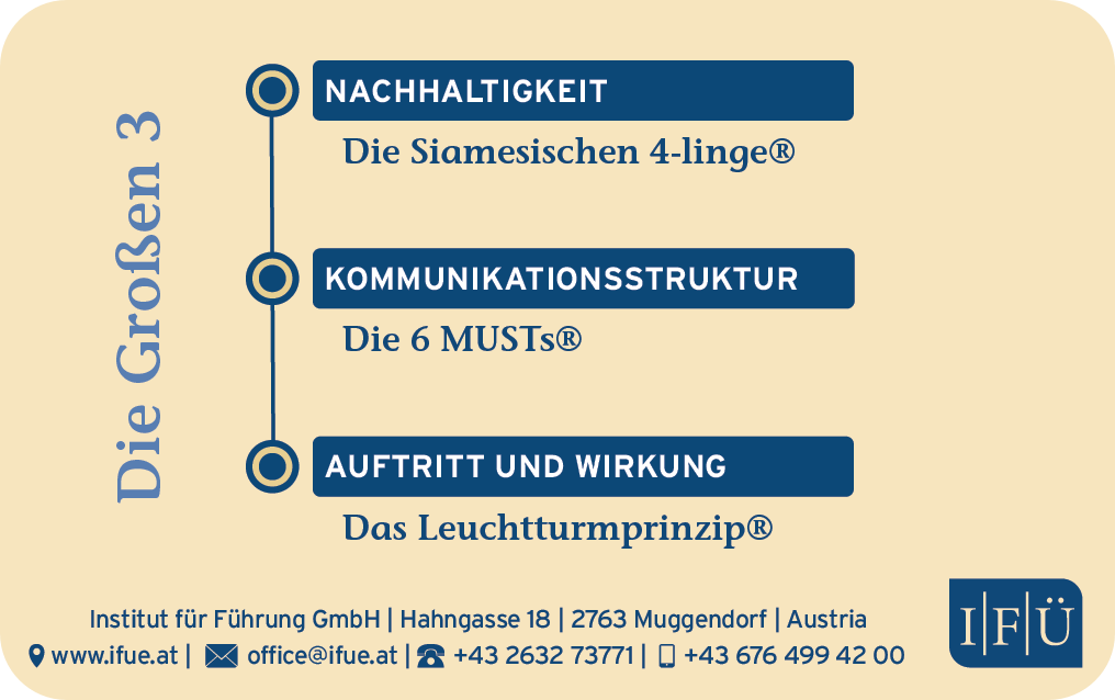 Die Großen 3 sind unsere meistverwendeten Führungswerkzeuge und bilden den Kern der täglichen Führugsarbeit. Jedes dieser Werkzeuge greift einen zentralen Hebel wirksamer Führung auf und schafft Klarheit in entscheidenden Momenten. Gemeinsam geben sie Struktur, Orientierung und Verbindlichkeit in der Führungspraxis.