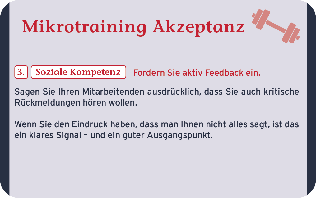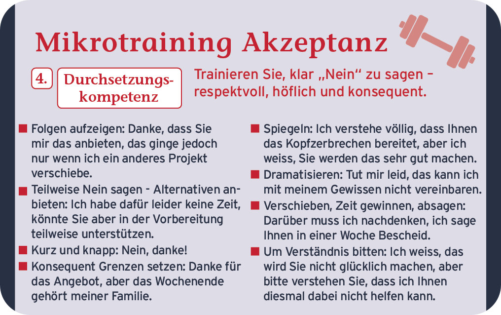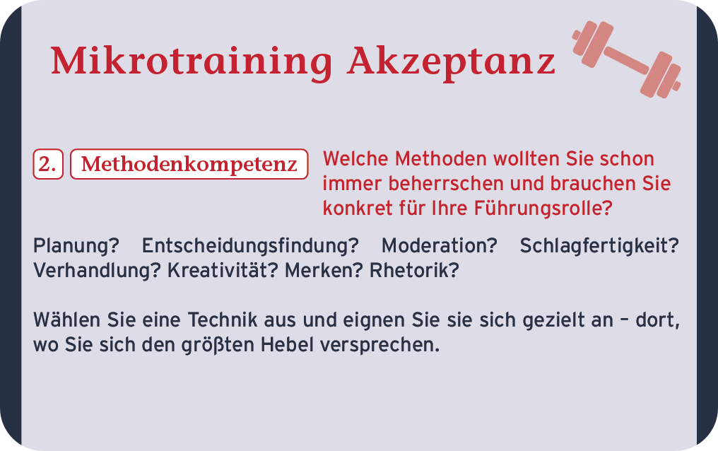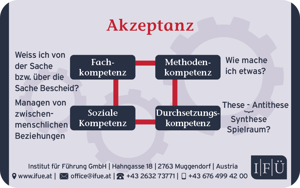 Akzeptanz entsteht, wenn Kompetenz als stimmig wahrgenommen wird. Wer fachlich weiß, wovon er spricht, methodisch sauber arbeitet, soziale Beziehungen bewusst gestaltet und Entscheidungen konsequent vertritt, schafft Vertrauen. Erst im Zusammenspiel dieser vier Dimensionen entsteht Glaubwürdigkeit – und damit der Spielraum, Führung wirksam auszuüben.