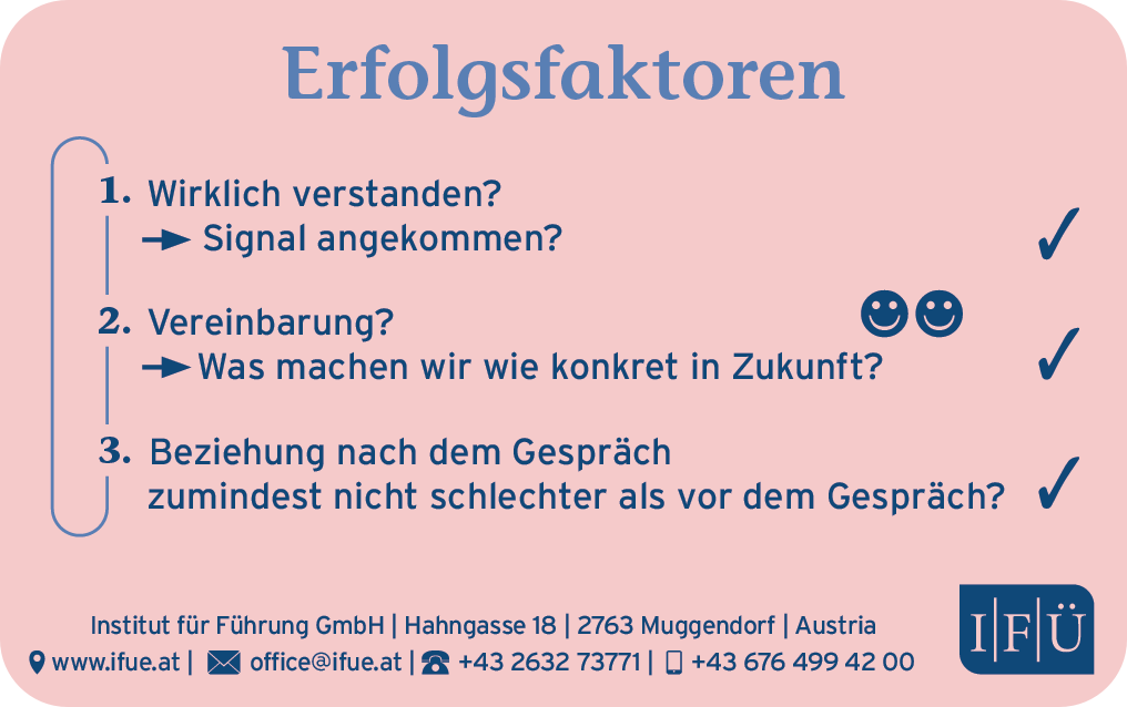 Drei Fragen entscheiden darüber, ob ein Gespräch Wirkung hatte oder lediglich stattgefunden hat. Wurde wirklich verstanden, wurde verbindlich vereinbart und ist die Beziehung tragfähig geblieben? Erst wenn alle drei Häkchen gesetzt sind, kann man von wirksamer Führung sprechen.
