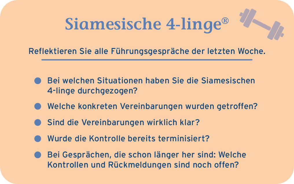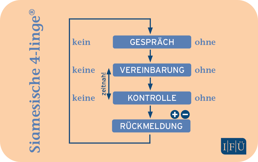 Die vier untrennbaren Schritte wirksamer Führung: Gespräch, Vereinbarung, Kontrolle und Rückmeldung. Fehlt ein Schritt, verliert Führung ihre Wirkung.
