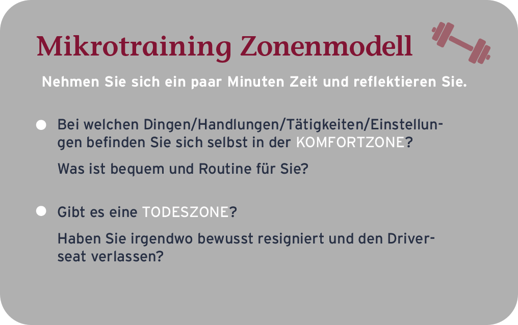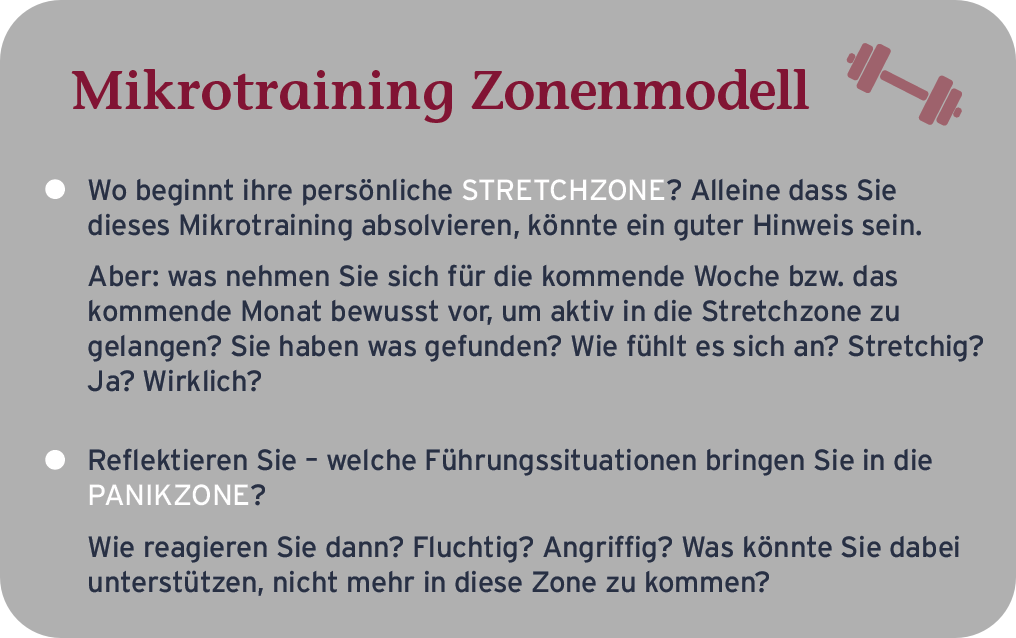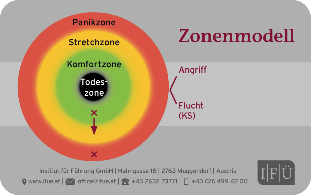 Das Zonenmodell beschreibt, wie Menschen auf Anforderungen und Druck reagieren. Innerhalb der Komfortzone fühlen wir uns sicher und handlungsfähig. In der Stretchzone wächst Entwicklung, weil Herausforderung auf vorhandene Stabilität trifft. Wird die Belastung jedoch zu groß, kippt das System in Stressreaktionen wie Angriff oder Flucht. Führung bedeutet, bewusst zu steuern, in welcher Zone gearbeitet wird – und Überforderung rechtzeitig zu erkennen.