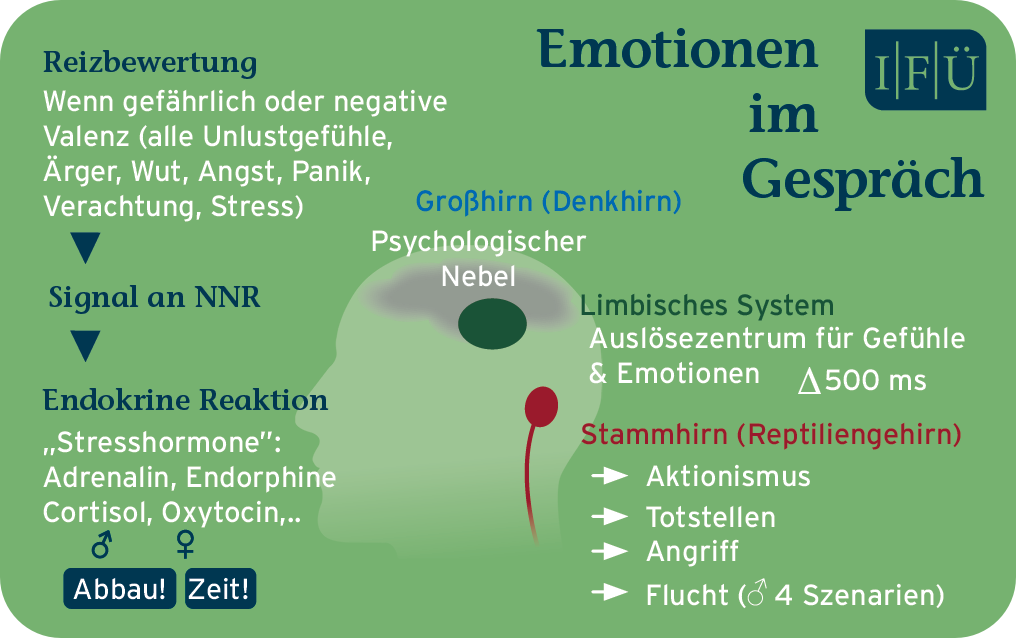 Emotionen entstehen schneller als Gedanken. Noch bevor das Denkzentrum einordnet, hat das limbische System bereits bewertet – und das Gespräch verändert sich. Unter Druck schaltet der Mensch auf Schutzprogramme: Angriff, Rückzug, Rechtfertigung oder Erstarren. Führung bedeutet deshalb, Emotionen zu erkennen, bevor sie eskalieren – und durch Klarheit, Tempo und Struktur wieder ins Denkzentrum zu führen. Wer Emotionen steuert, steuert Gespräche.