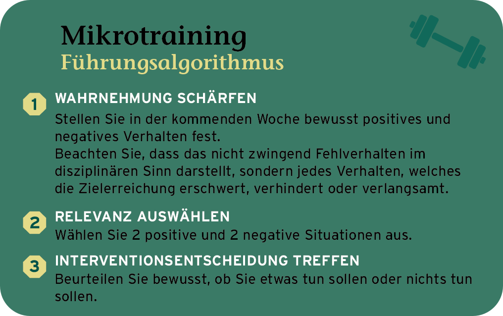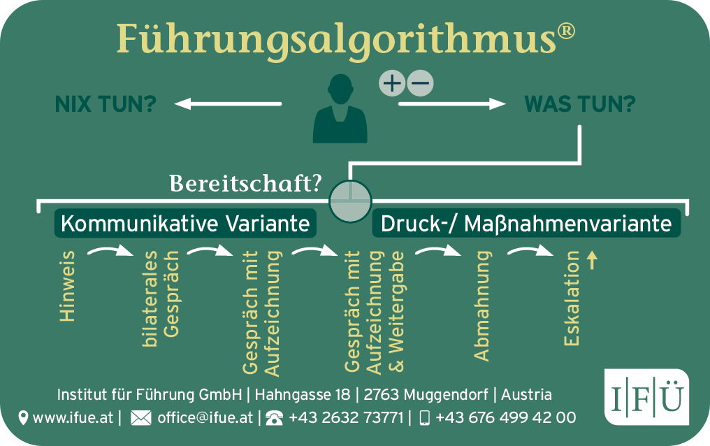 Der Führungsalgorithmus beschreibt die Logik hinter jeder Intervention: beobachten, bewerten, entscheiden, handeln – oder bewusst nicht handeln. Er schafft Klarheit darüber, wann Kommunikation genügt und wann Konsequenz notwendig wird. Statt spontan zu reagieren, führt er durch eine strukturierte Eskalationslogik. So entsteht Führung aus bewusster Entscheidung – nicht aus Stimmung oder Druck.