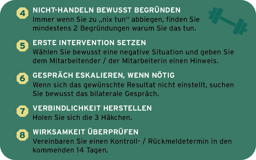 Die vier untrennbaren Schritte wirksamer Führung: Gespräch, Vereinbarung, Kontrolle und Rückmeldung. Fehlt ein Schritt, verliert Führung ihre Wirkung.